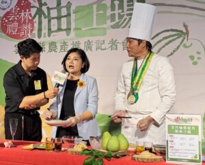 院長隨後致詞時表示,今天很開心來參與雲林縣文旦柚推廣記者會活動。他提到,大家都知道台南文旦很有名,但別忘了雲林縣的文旦已經後來居上,雲林古坑一帶的文旦柚子因為品種優良,更長年外銷到國外。本草綱目提到文旦柚子可以幫助整腸消化、止咳化痰,富含大量維他命C,對腸胃有非常大的幫助。