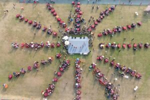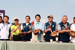茶博會大型活動輪番上陣,由水里農會負責的千人擂茶,10日下午登場,許縣長偕同副縣長王瑞德、水里農會幹部等人在台上示範製作擂茶,台下參加民眾依照標示順序,將茶葉、花生、芝麻、米、堅果等五穀雜糧,在擂缽中磨成細糊狀,再沖入熱水飲用。