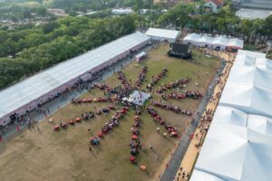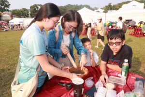 茶博會今年最特別,喝擂茶,為國家慶生外,晚上還可以看國慶焰火;千人擂茶現場,有呼朋引伴的民眾,聚在一起擂茶;也有一家大小出遊,在中興新村大操場上,做擂茶,沖泡後飲用,自在聊天,度過悠閒的下午。