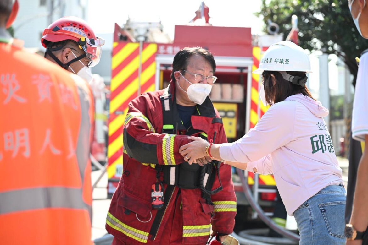 邱議瑩在臉書貼出照片表示:「這位特搜大隊的大隊長蘇裕銘,即使口罩與制服滿是灰燼,仍展現謙和而堅定的神情,讓我對消防同仁的敬佩無以言表。」