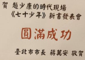 院長最後表示,台灣民主走到今日著實不易,而趙董事長在這條民主道路上開創諸多不可思議的先河,值得政治後輩學習效法。今天趙董事長選擇回到立法院娘家發表這本新書,諸多立法委員及好朋友們一起共襄盛舉來到現場,相信是對這位政壇前輩充滿敬佩之心。他祝福這本書能成功熱賣,也帶給大家諸多啓發,並祝福趙董事長身體健康,未來期待趙董事長在七十少年之際,能夠繼續號召更多國人同胞發自內心對中華民國產生更多的熱愛與對台灣這片土地投入更多的關注。最後,在歲末年初之際,院長也祝福現場所有嘉賓,大家馬上幸福、新年快樂。