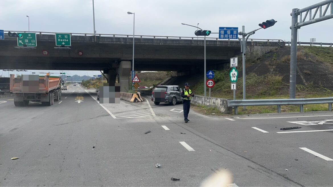 岡山分局於今(10)日 8 時許接獲報案,在燕巢區國道十號交流道口發生交通事故。經查為 40 歲方姓男子駕駛營業曳引車東往西下交流道,行經路口時因不明原因闖紅燈,與沿嘉寶路南往北直行之徐姓男子自小客車發生碰撞,造成雙方駕駛及乘客共 4 人受輕傷,送醫後均無生命危險,雙方酒測值均為 0。事發當下,路口一輛營業曳引車為閃避事故急煞導致故障,現場另有一輛自小客車遭事故噴濺物品波及,造成車燈受損。