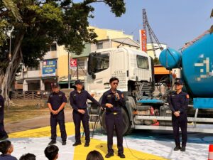 在宣導方面,前鎮分局於3月25日上午9時前往前鎮區仁愛國小舉辦「大型車進入校園交通安全宣導活動」,由分局長黃元民與校長孫國華共同主持,現場約有全校師生200人參與。活動最大亮點為將大型車輛實際駛入校園,並安排混擬土攪拌車進行展示,讓學生透過「親身體驗」方式,實際登上駕駛座,從駕駛視角觀察車輛四周視野,了解大型車「視野死角」及轉彎時「內輪差」所帶來的潛在危險。透過沉浸式體驗,加深學童對大型車風險的認識,並建立「遠離大型車」的正確觀念。