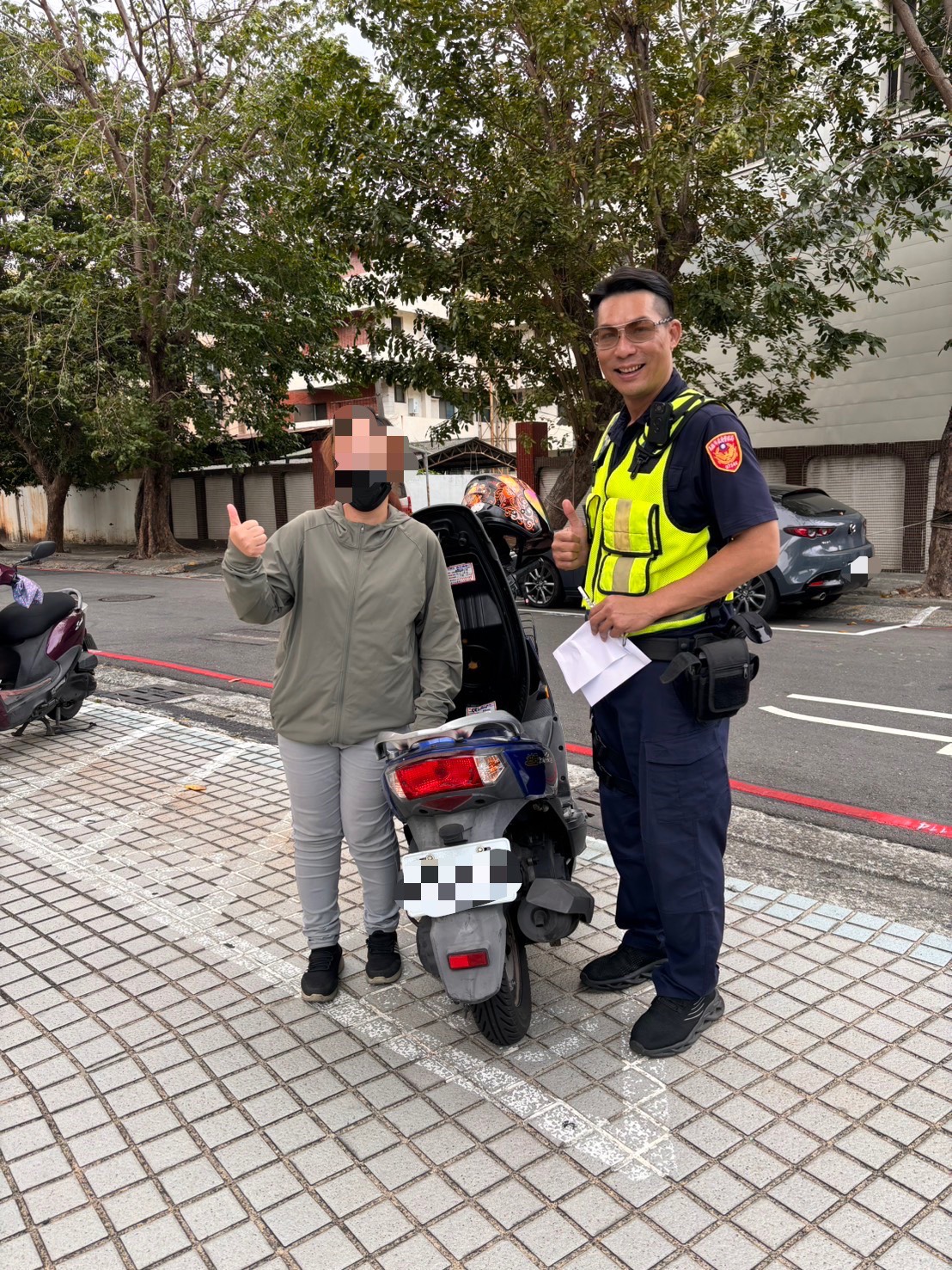 前鎮分局瑞隆派出所警員黃芳祥於(26)日16時於派出所內見鄭姓女子(年約40歲)神情慌張的走進派出所,黃員上前關心了解後得知,原來鄭女原先騎機車至派出所要領取司法文書,未料自己在派出所外停好車卻不慎將機車鑰匙也一起鎖進車廂內,鄭女試圖把機車車廂扳開,但可能力氣不足一直無法順利取出車鑰匙,黃員安撫鄭女並立即帶鄭女回家找機車備用鑰匙,所幸有找到備用鑰匙將機車車廂打開,鄭女開心地向黃員比個大大的讚,感謝黃員積極的協助,才能讓事情順利解決。