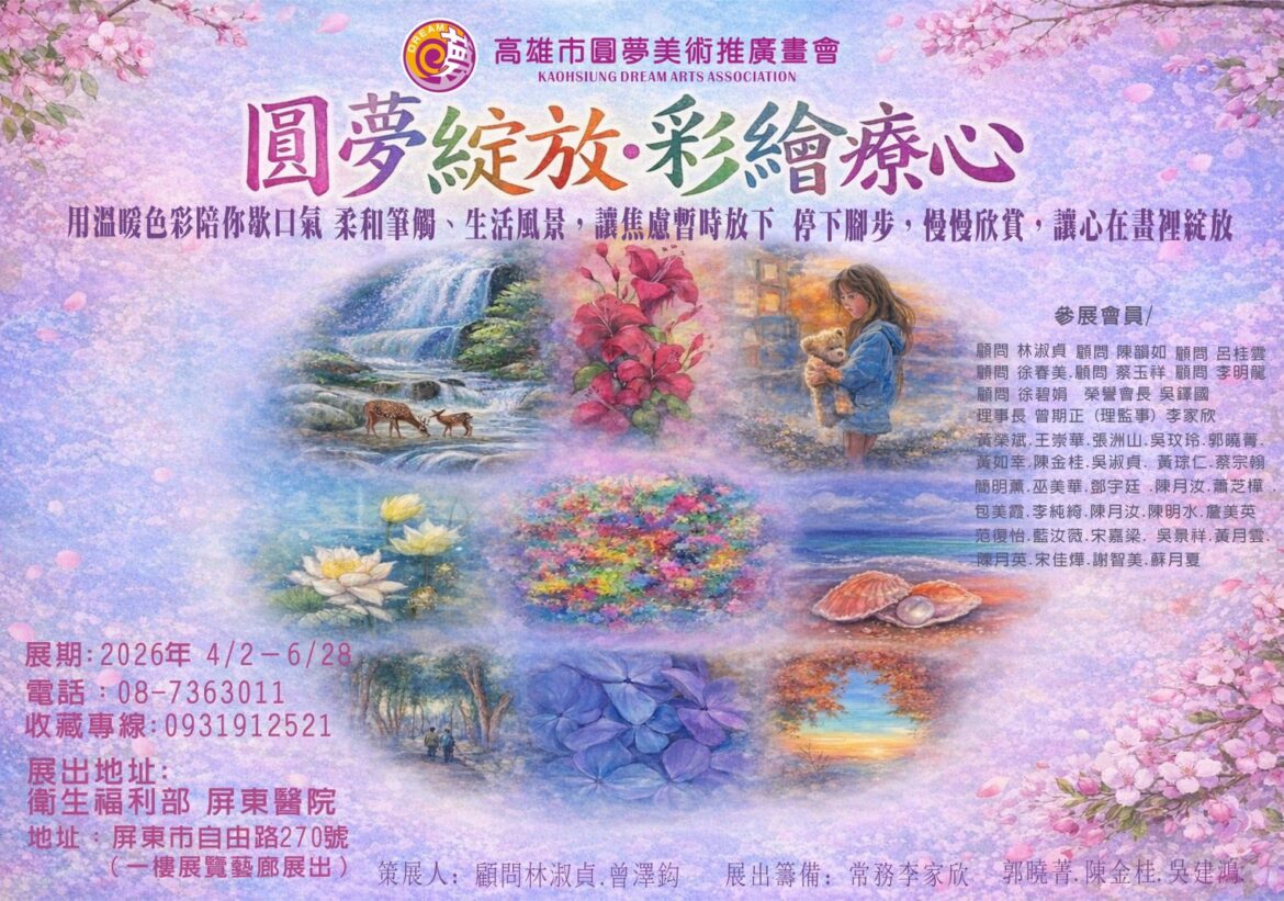 高雄市圓夢美術畫會會員聯展《圓夢綻放·彩繪療心》,將於2026年4月2日至6月28日,在屏東署立醫院一樓展覽藝廊展出,邀請民眾於醫療空間中感受藝術帶來的溫暖與療癒。