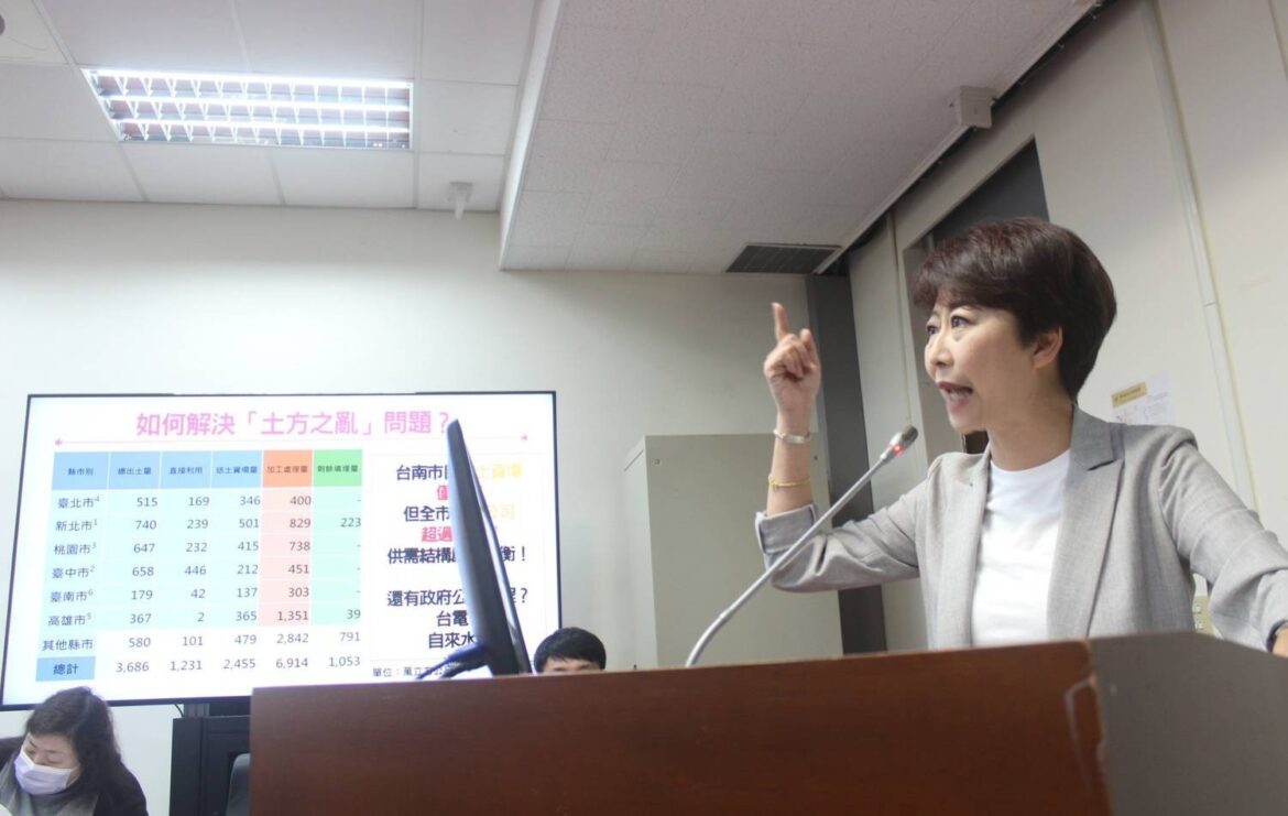 台南土方供需失衡!陳亭妃質詢:台電工程不能因「土方沒地方處理」而將工程停擺。她指出,台南市目前土資場僅有 13 家,但全市建設公司超過 2000 家,加上龐大的政府公共工程、台電電纜地下化及自來水管線工程,土方去化量能嚴重不足,「現在台電有很多工程都停擺,主要原因竟然是土方沒地方去!」