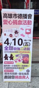 為推動公益捐血、傳遞社會溫暖,高雄市德播會今(10)日於前金區中正、自強路口頂鮮台南擔仔麵餐廳前,舉辦「第十三屆第一次會員大會」暨「捐血有愛.德播傳情」捐血活動,吸引大批民眾踴躍參與,共募集約322袋熱血,為醫療用血注入一股暖流。