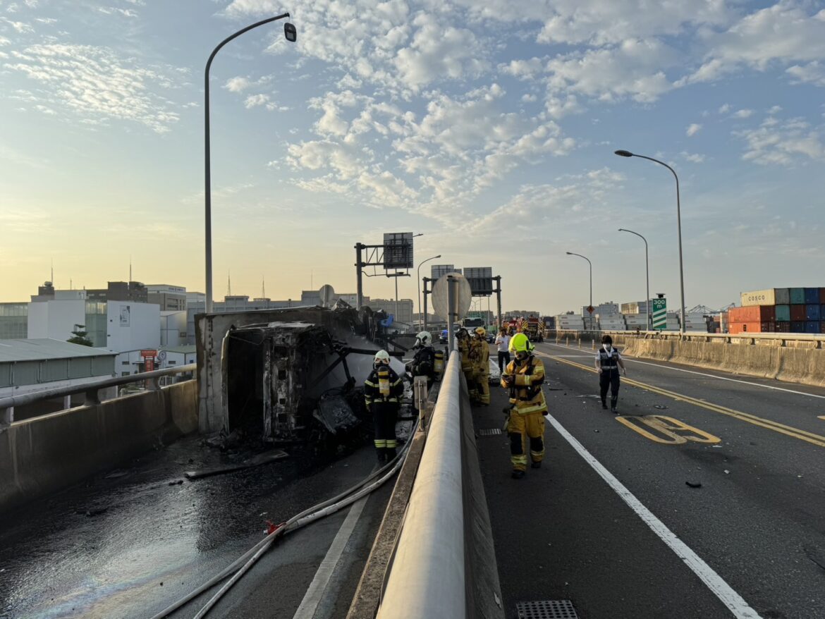 經查陳姓男子(年約24歲)駕駛營業大貨車於新生路高架橋北上往第二貨櫃中心匝道口,疑似碰撞匝道口水泥護欄而翻覆,導致車輛起火燃燒,119消防人員與救護人員到場,協助滅火及救護後,駕駛陳男已明顯無生命跡象;警方立即通知鑑識人員到場蒐證,後續將依規定報請檢察官相驗,確認詳細死亡原因(是否因身體不適而導致自撞水泥護欄),至於詳細肇事責任,仍待交通大隊進一步分析研判。